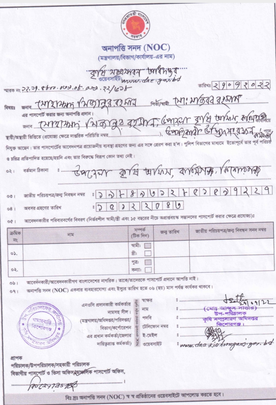 মোহাম্মদ মিজানুর রহমান এর পাসপোর্ট অনাপত্তিপত্র